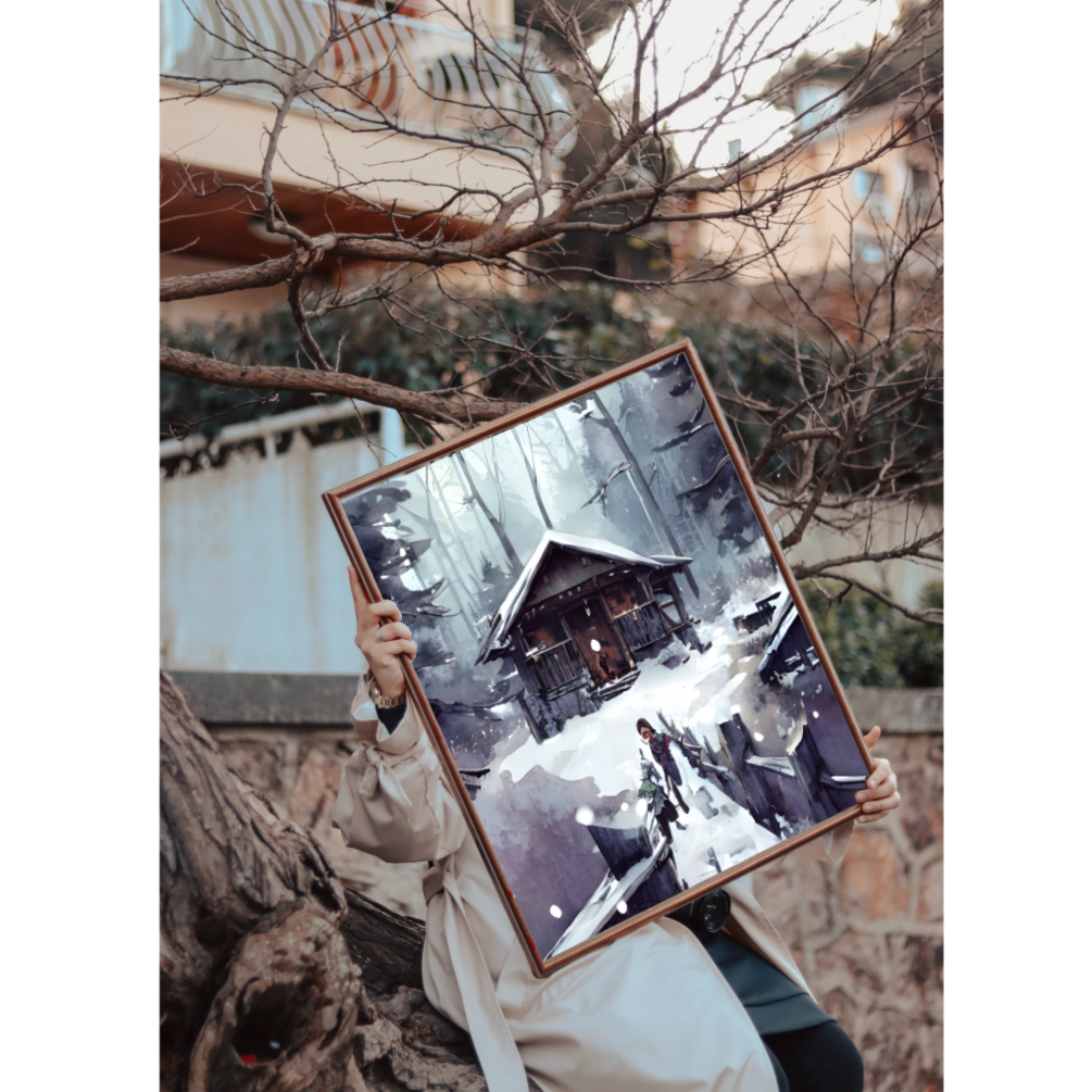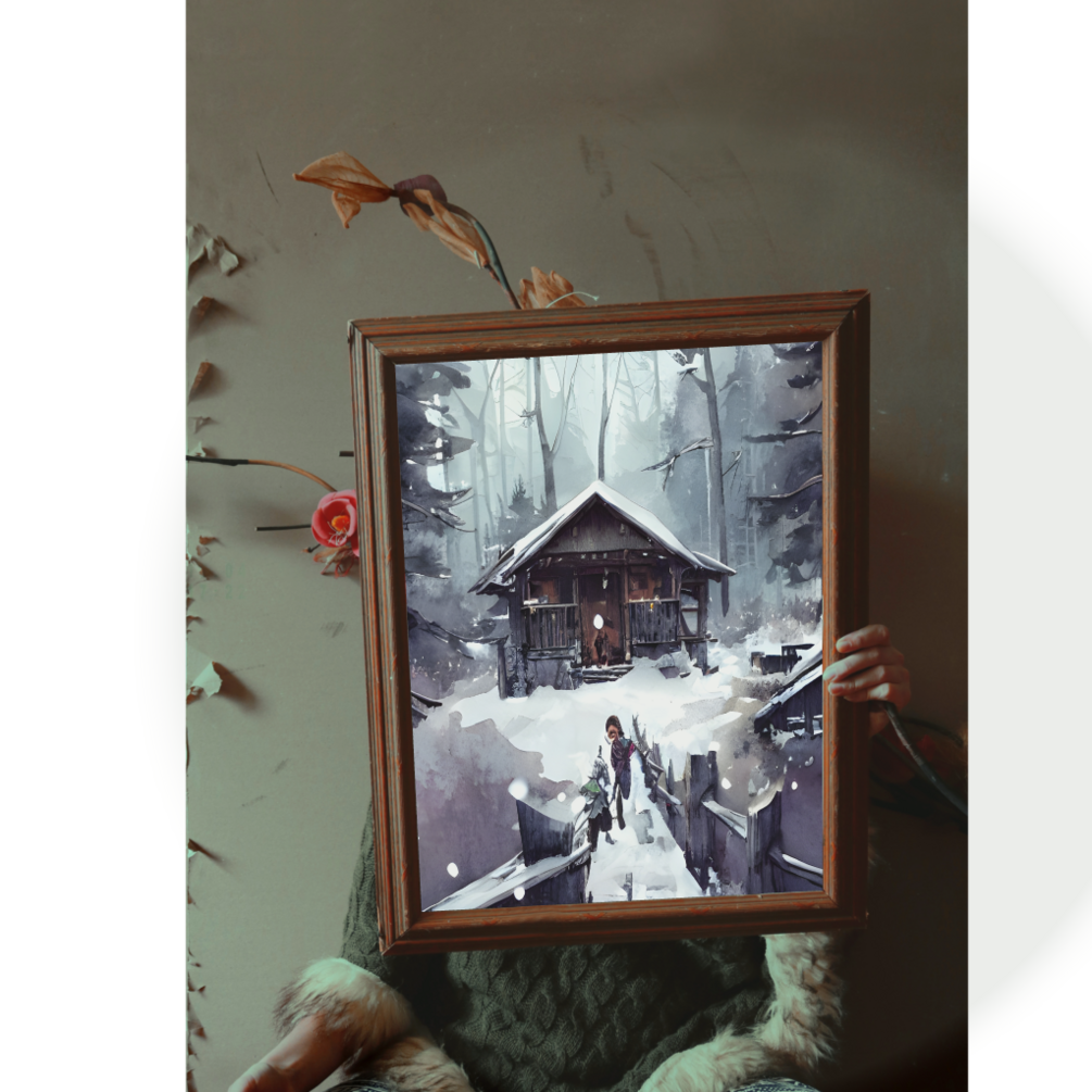 Watercolour painting that's inviting you along a trail and into a snowy cabin in the woods or a woody area cover in snow. Perfect for the entrance and lounge of your home.